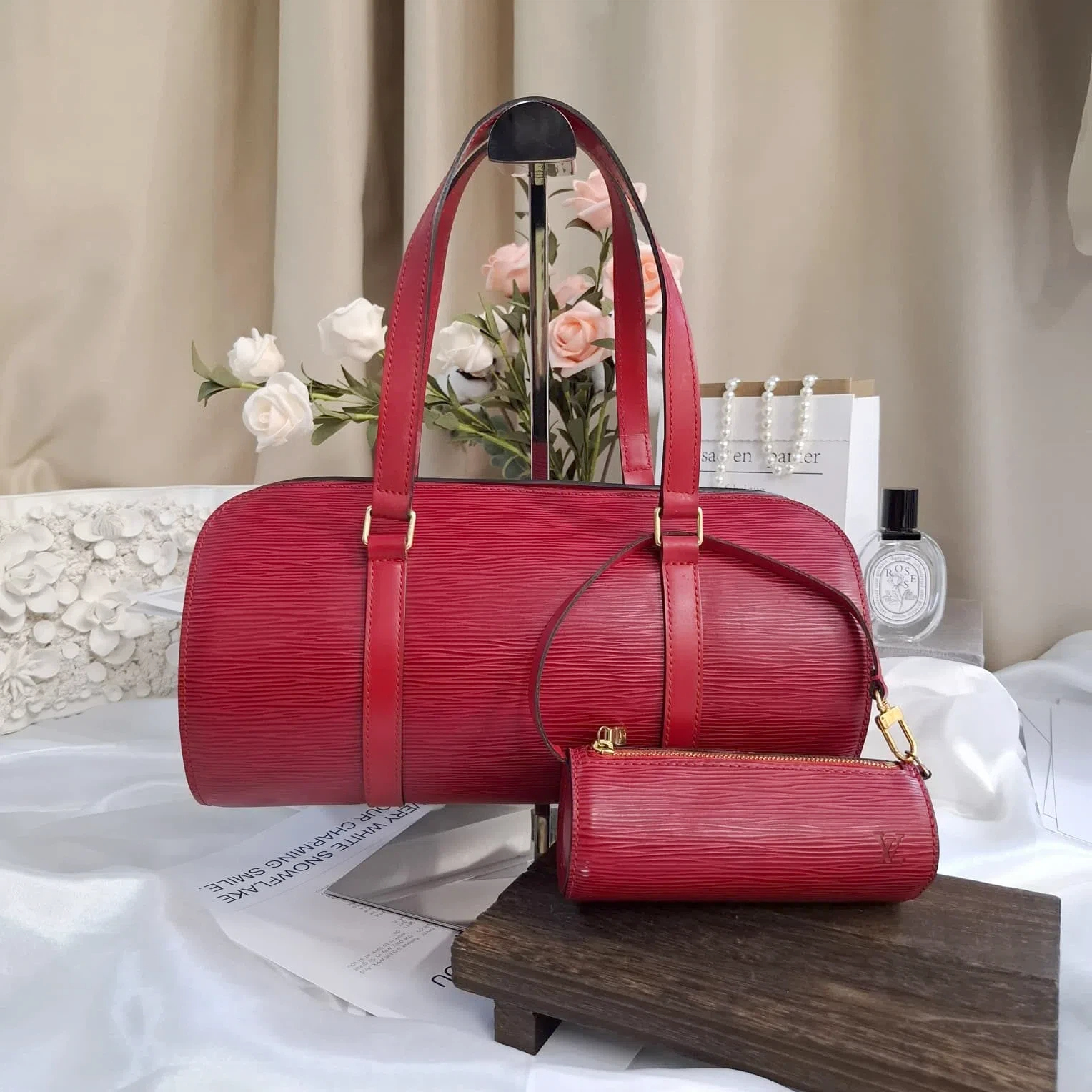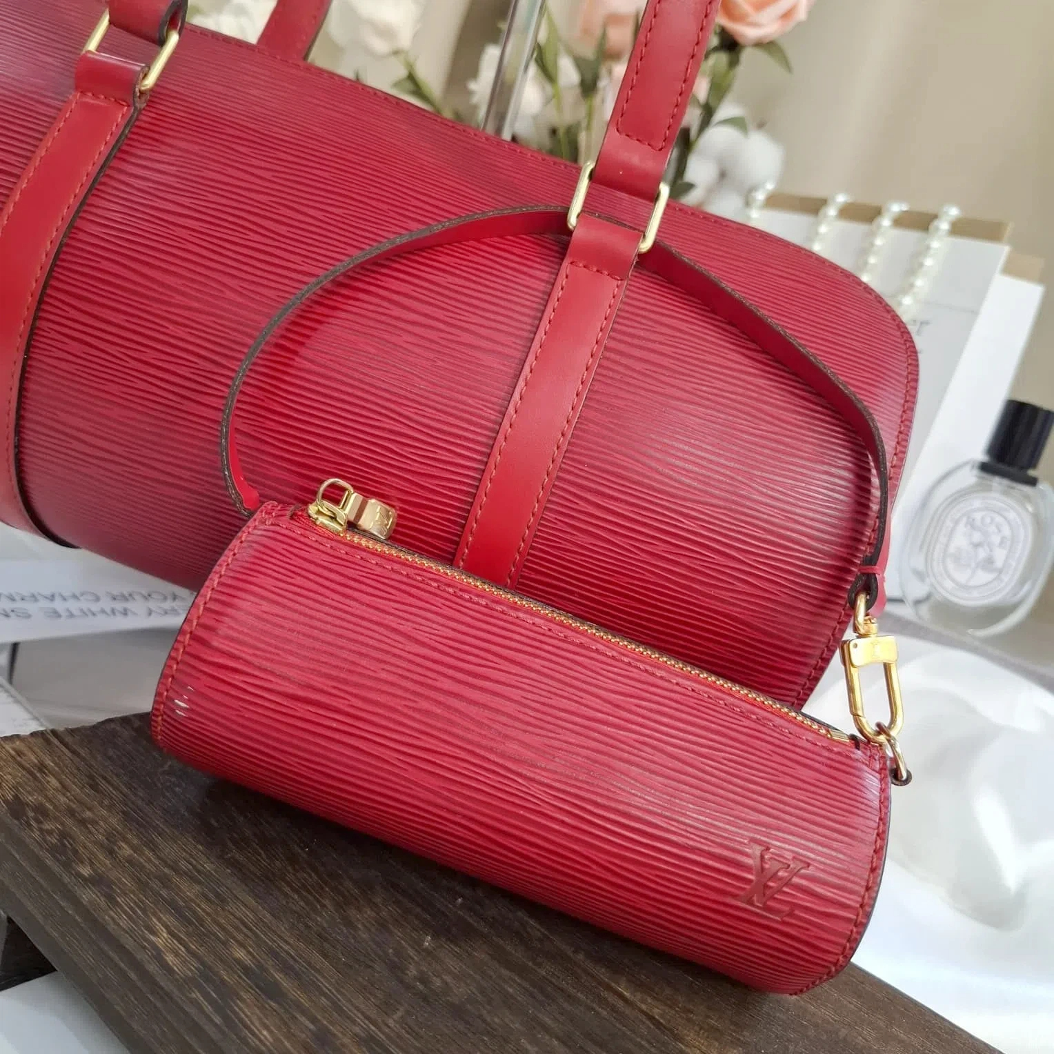 LV 紅色水波紋水桶袋(附圓桶小包)